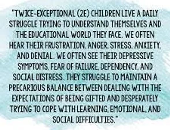 What is twice exceptional (2e)? The term “twice exceptional” or “2e” refers to intellectually gifted children who have one or more learning disabilities such as dyslexia, ADHD, or autism spectrum
